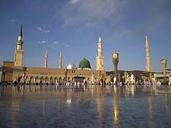 Shortly before the advent of Islam, apart from urban trading settlements (such as Mecca and Medina), much of what was to become Saudi Arabia was populated by nomadic pastoral tribal societies.[79] The Islamic prophet Muhammad was born in Mecca in about 570 CE. In the early 7th century, Muhammad united the various tribes of the peninsula and created a single Islamic religious polity.[80] Following his death in 632, his followers expanded the territory under Muslim rule beyond Arabia, conquering territory in the Iberian Peninsula in the west, to parts of Central and South Asia in the east, in a matter of decades.[21][22][23] Arabia became a more politically peripheral region of the Muslim world as the focus shifted to the newly conquered lands.[80]