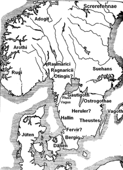 In the same area there were the Granni (Grenland),[21] Augandzi (Agder),[21] Eunixi, Taetel, Rugii (Rogaland),[21] Arochi (Hordaland),[21] and Ranii (possibly the people of Romsdalen).[21] The king Rodulf was of the Ranii but left his kingdom and joined Theodoric, king of the Goths.