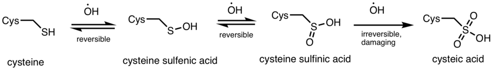 Moreso than other enzymes in the Calvin cycle, SBPase levels have a significant impact on plant growth, photosynthetic ability, and response to environmental stresses. Small decreases in SBPase activity result in decreased photosynthetic carbon fixation and reduced plant biomass.[17] Specifically, decreased SBPase levels result in stunted plant organ growth and development compared to wild-type plants,[18] and starch levels decrease linearly with decreases in SBPase activity, suggesting that SBPase activity is a limiting factor to carbon assimilation.[19] This sensitivity of plants to decreased SBPase activity is significant, as SBPase itself is sensitive to oxidative damage and inactivation from environmental stresses. SBPase contains several catalytically relevant cysteine residues that are vulnerable to irreversible oxidative carbonylation by reactive oxygen species (ROS),[20] particularly from hydroxyl radicals created during the production of hydrogen peroxide.[21] Carbonylation results in SBPase enzyme inactivation and subsequent growth retardation due to inhibition of carbon assimilation.[18] Oxidative carbonylation of SBPase can be induced by environmental pressures such as chilling, which causes an imbalance in metabolic processes leading to increased production of reactive oxygen species, particularly hydrogen peroxide.[21] Notably, chilling inhibits SBPase and a related enzyme, fructose bisphosphatase, but does not affect other reductively activated Calvin cycle enzymes.[22]