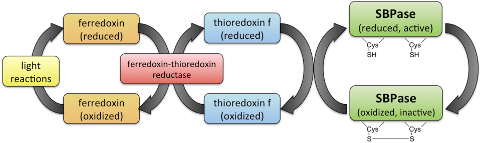 SBPase is involved in the regeneration of 5-carbon sugars during the Calvin cycle. Although SBPase has not been emphasized as an important control point in the Calvin cycle historically, it plays a large part in controlling the flux of carbon through the Calvin cycle.[9] Additionally, SBPase activity has been found to have a strong correlation with the amount of photosynthetic carbon fixation.[10] Like many Calvin cycle enzymes, SBPase is activated in the presence of light through a ferredoxin/thioredoxin system.[11] In the light reactions of photosynthesis, light energy powers the transport of electrons to eventually reduce ferredoxin. The enzyme ferredoxin-thioredoxin reductase uses reduced ferredoxin to reduce thioredoxin from the disulfide form to the dithiol. Finally, the reduced thioredoxin is used to reduced a cysteine-cysteine disulfide bond in SBPase to a dithiol, which converts the SBPase into its active form.[7]