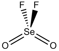 The shape of the molecule is a distorted tetrahedron with the O-Se-O angle being 126.2°, the O-Se-F angle being 108.0° and F-Se-F being 94.1°.[3] The Se-F bond length is 1.685 Å and the selenium to oxygen bond is 1.575 Å long.[4]