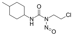 Semustine (1-(2-chloroethyl)-3-(trans-4-methylcyclohexyl)-1-nitrosourea, MeCCNU) is an alkylating nitrosourea compound used in chemotherapy treatment of various types of tumours.[1][2] Due to its lipophilic property, semustine can cross the blood-brain barrier for the chemotherapy of brain tumours, where it interferes with DNA replication in the rapidly-dividing tumour cells.[2] Semustine, just as lomustine, is administered orally. Evidence has been found that treatment with semustine can cause acute leukaemia as a delayed effect in very rare cases.[3]
