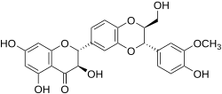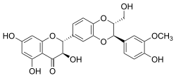 Silibinin (INN), also known as silybin (both from Silybum, the generic name of the plant from which it is extracted), is the major active constituent of silymarin, a standardized extract of the milk thistle, containing a mixture of flavonolignans consisting of silibinin, isosilibinin, silychristin, silidianin, and others. Silibinin itself is a mixture of two diastereomers, silybin A and silybin B, in approximately equimolar ratio.[1] Silibinin is used in pure forms as a medication, and more frequently as an active ingredient in milk thistle–derived herbal supplements.