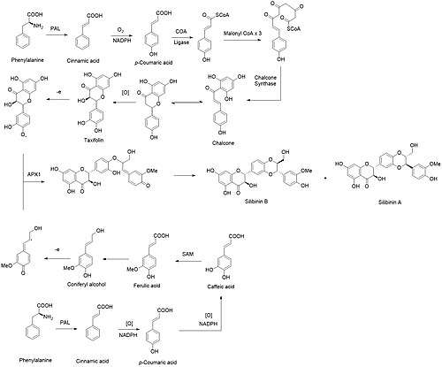 The biosynthesis of silibinin A and silibinin B is composed of two major parts, taxifolin and coniferyl alcohol.[30][31] Coniferyl alcohol is synthesized in milk thistle seed coat. Starting with the transformation of phenylalanine into cinnamic acid mediated by phenylalanine ammonia-lyase.[32] Cinnamic acid will then go through two rounds of oxidation by trans-cinnamate 4-monooxygenase and 4-coumarate 3-hydroxylase to give caffeic acid. The meta position alcohol is methylated by caffeic acid 3-O-methyltransferase to produce ferulic acid. From ferulic acid, the production of coniferyl alcohol is carried out by 4-hydroxycinnamate CoA ligase, cinnamoyl CoA reductase, and cinnamyl alcohol dehydrogenase. For taxifolin, its genes for the biosynthesis can be overexpressed in flowers as the transcription is light dependent. The production of taxifolin utilizes a similar pathway as for synthesizing p-coumaric acid followed by three times of carbon chain elongation with malonyl-CoA and cyclization by chalcone synthase and chalcone isomerase to yield naringenin. Through flavanone 3-hydroxylase and flavonoid 3'-monooxygenase, taxifolin is furnished. To merge taxifolin and coniferyl alcohol, taxifolin can be translocated from the flower to the seed coat through symplast pathway. Both taxifolin and coniferyl alcohol will be oxidized by ascorbate peroxidase 1 to enable the single electron reaction to couple two fragments generating silybin (silibinin A + silibinin B).