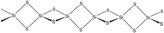 The material is formed by heating silicon and sulfur or by the exchange reaction between SiO2 and Al2S3. The material consists of chains of edge-shared tetrahedra, -Si(μ-S)2Si(μ-S)2-.[2]
