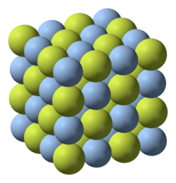 The structure of AgF has been determined by X-ray diffraction.[10][11]: 3736 [5] At ambient temperature and pressure, silver(I) fluoride exists as the polymorph AgF-I, which adopts a cubic crystal system with space group Fm3m in the Hermann–Mauguin notation. The rock salt structure is also adopted by the other silver monohalides. The lattice parameter is 4.936(1) Å, significantly lower than those of AgCl and AgBr.[12]: 562 Neutron and X-ray diffraction studies have further shown that at 2.70(2) GPa, a structural transition occurs to a second polymorph (AgF-II) with the caesium chloride structure, and lattice parameter 2.945 Å.[13]: 7945 [14]: 770 The associated decrease in volume is approximately ten percent.[13]: 7946 A third polymorph, AgF-III, forms on reducing the pressure to 2.59(2) GPa, and has an inverse nickel arsenide structure. The lattice parameters are a = 3.244(2) Å and c = 6.24(1) Å; the rock salt structure is regained only on reduction of the pressure to 0.9(1) GPa. Non-stochiometric behaviour is exhibited by all three polymorphs under extreme pressures.[15]: 939 [13]: 7947