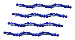 X-ray crystallography shows that AgN3 is a coordination polymer with square planar Ag+ coordinated by four azide ligands. Correspondingly, each end of each azide ligand is connected to a pair of Ag+ centers. The structure consists of two-dimensional AgN3 layers stacked one on top of the other, with weaker Ag–N bonds between layers. The coordination of Ag+ can alternatively be described as highly distorted 4 + 2 octahedral, the two more distant nitrogen atoms being part of the layers above and below.[3]