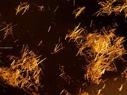 Fulminates are toxic, about the same as cyanides.[3] When pure, silver fulminate is chemically stable, not decomposing after years of storage. Like many silver salts, it darkens with light exposure. It is slightly soluble in cold water and can be recrystallized using hot water.[3][4] It can also be recrystallized from a 20% solution of ammonium acetate.[3] It is not hygroscopic and can explode when moist or under water; it was reported to remain explosive after 37 years under water.[3] It explodes upon contact with concentrated sulfuric acid or chlorine or bromine, but not when contacting iodine.[3] It is insoluble in nitric acid, but dissolves in ammonia, alkali chlorides, alkali cyanides, aniline, pyridine, and potassium iodide by forming complexes.[3] Concentrated hydrochloric acid decomposes it non-explosively with a hissing noise; thiosulfate also decomposes it non-explosively, and can be used for disposal.[3]