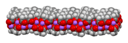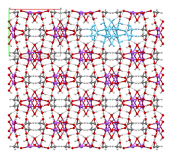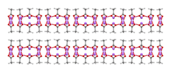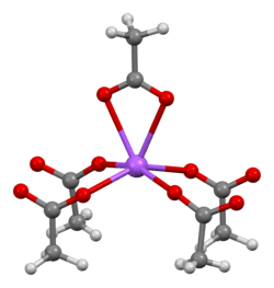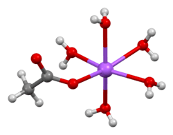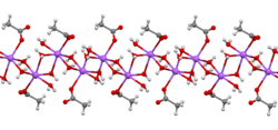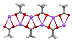 The crystal structure of anhydrous sodium acetate has been described as alternating sodium-carboxylate and methyl group layers.[19] Sodium acetate trihydrate's structure consists of distorted octahedral coordination at sodium. Adjacent octahedra share edges to form one-dimensional chains. Hydrogen bonding in two dimensions between acetate ions and water of hydration links the chains into a three-dimensional network.[20][21]