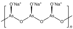 n associated with sodium cations, Na+. The polymer backbone has the connectivity -O-As(O−)-.[2] backbone. Sodium ortho-arsenite is Na3AsO3.[3] Both compounds are colourless solids. A mixture of sodium meta-arsenite and sodium ortho-arsenite is produced by treating arsenic trioxide with sodium carbonate or sodium hydroxide.[4] Sodium arsenite is amorphous, typically being obtained as a powder or as a glassy mass.