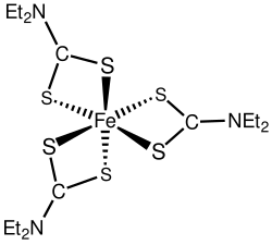 Diethyldithiocarbamate reacts with many metal salts to give transition metal dithiocarbamate complexes. The ligands coordinate via the two sulfur atoms. Other more complicated bonding modes are known including binding as unidentate ligand and a bridging ligand using one or both sulfur atoms.[3]