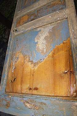 A solution of sodium hydroxide in water was traditionally used as the most common paint stripper on wooden objects. Its use has become less common, because it can damage the wood surface, raising the grain and staining the colour.