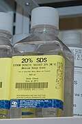 SDS is used in cleaning procedures,[11] and is commonly used as a component for lysing cells during RNA extraction or DNA extraction, inhibiting the activity of nucleases, enzymes that can degrade DNA, protecting the integrity of the isolated genetic material, and for denaturing proteins in preparation for electrophoresis in the SDS-PAGE technique.[12]