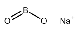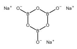 Sodium metaborate is a chemical compound of sodium, boron, and oxygen with formula NaBO2.[3] However, the metaborate ion is trimeric in the anhydrous solid, therefore a more correct formula is Na3B3O6 or (Na+)3[B3O6]3−. The formula can be written also as Na2O·B2O3 to highlight the relation to the main oxides of sodium and boron.[2] The name is also applied to several hydrates whose formulas can be written NaBO2·nH2O for various values of n.