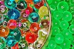 Hydrogel beads made of sodium polyacrylate are used as expandable water toys, and as ammunition for gel blaster toy guns. It is also a key component of the gel used for nuru massage.[20]