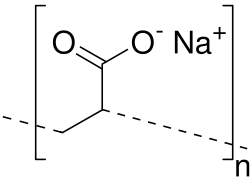 Sodium polyacrylate (ACR, ASAP, or PAAS),[1]: 233 also known as waterlock, is a sodium salt of polyacrylic acid with the chemical formula [−CH2−CH(CO2Na)−]n and has broad applications in consumer products. This super-absorbent polymer (SAP) has the ability to absorb 100 to 1000 times its mass in water. Sodium polyacrylate is an anionic polyelectrolyte[2] with negatively charged carboxylic groups in the main chain. It is a polymer made up of chains of acrylate compounds. It contains sodium, which gives it the ability to absorb large amounts of water. When dissolved in water, it forms a thick and transparent solution due to the ionic interactions of the molecules. Sodium polyacrylate has many favorable mechanical properties. Some of these advantages include good mechanical stability, high heat resistance, and strong hydration.
