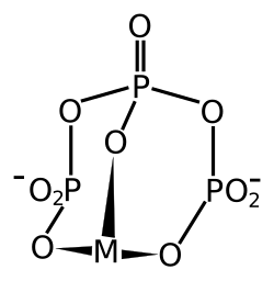 STPP is a colourless salt, which exists both in anhydrous form and as the hexahydrate. The anion can be described as the pentanionic chain [O3POP(O)2OPO3]5−.[4][5] Many related di-, tri-, and polyphosphates are known including the cyclic triphosphate (e.g. sodium trimetaphosphate). It binds strongly to metal cations as both a bidentate and tridentate chelating agent.