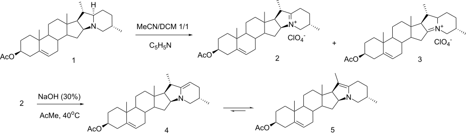 In 1994, Gunic and coworkers reported the electrochemical oxidation of 3β-acetoxy-solanidine in CH3CN/CH2Cl2 1/1 with pyridine as a base. The corresponding iminium salts 2 and 3 were obtained in a 1/1 ratio in good yield. Performing this electrochemical reaction in DCM with pyridine gives 3 in 95% yield, while the same reaction in acetone gives iminium salt 2 in 95% yield. Iminium ion 2 can be isomerized to the thermodynamically more stable enamine 5. THis isomerization is believed to proceed via enamine 4, which is the kinetic product.