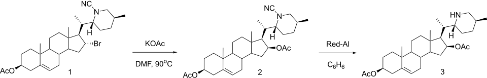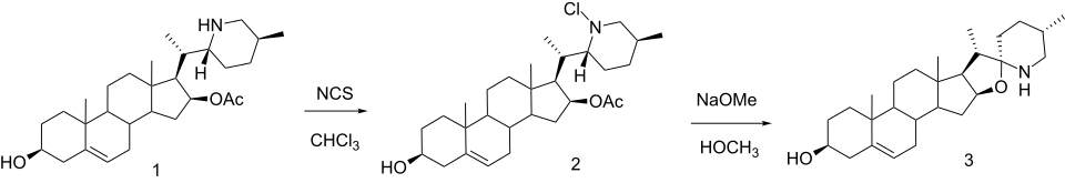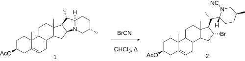 In 1968, Beisler and Sato synthesized tomatidenol from solanidine, and reported the successful opening of the E ring of solanidine via the von Braun reaction.[18][19] Only in case of acetylated solanidine the von Braun reaction gave the E ring-opened product in 78% yield.