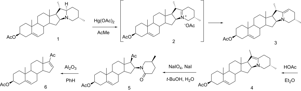 In 1997, Gaši et al. reported a short procedure for the degradation of solanidine to 16-Dehydropregnenolone acetate. Instead of applying the electrochemical oxidation, Hg(OAc)2 in acetone was used as oxidizing agent. The advantage of this reagent and solvent system was the ease of use and the selective formation of iminium salt 2, which spontaneously isomerized to enamine 3 (94%). This enamine was then subjected to another isomerization, which yielded the more thermodynamically more stable enamine 4. NaIO4-oxidation opened up the cyclic enamine and gave lactam 5. Elimination of the lactam part with Al2O3 in benzene afforded in 34% 16-dehydropregnenolone acetate (DPA) (6). Using K2CO3 in benzene followed by reacetylation produced 6 in a lower yield (11%).