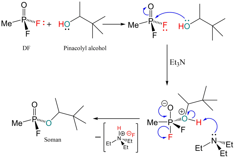 Soman is synthesized by reacting pinacolyl alcohol with methylphosphonyl difluoride. The result of this reaction is the forming of soman which is described as “colorless liquid with a somewhat fruity odor.” The low vapor pressure of soman will also produce the volatile gas form of soman. Also, the acid hydrogen fluoride will form due to the elimination of fluoride and a proton. This acid is indirectly dangerous to humans. Skin contact with hydrogen fluoride will cause an immediate reaction with water which produces hydrofluoric acid.[5]