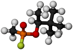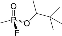 Soman (or GD, EA 1210, Zoman, PFMP, A-255, systematic name: O-pinacolyl methylphosphonofluoridate)[1] is an extremely toxic chemical substance. It is a nerve agent, interfering with normal functioning of the mammalian nervous system by inhibiting the enzyme cholinesterase. It is an inhibitor of both acetylcholinesterase and butyrylcholinesterase.[2] As a chemical weapon, it is classified as a weapon of mass destruction by the United Nations according to UN Resolution 687. Its production is strictly controlled, and stockpiling is outlawed by the Chemical Weapons Convention of 1993 where it is classified as a Schedule 1 substance. Soman was the third of the so-called G-series nerve agents to be discovered along with GA (tabun), GB (sarin), and GF (cyclosarin).