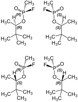 Soman (C(±)P(±)-soman) has four stereoisomers, each with a different toxicity, though largely similar. The stereoisomers are C(+)P(+)-soman, C(+)P(−)-soman C(−)P(−)-soman and C(−)P(+)-soman.[7][8]