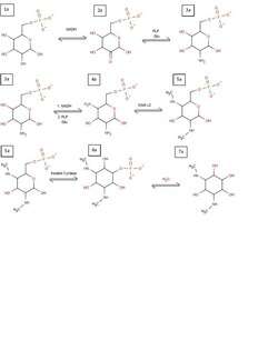 While all this happens, an alternate pathway is occurring creating the sugar functional group from a similar starting product. In this pathway, glucose-1-phosphate is used as the starting product (1b). This is converted into a TDP-glucose through TDP synthase (2b). TDP glucose then has the hydroxyl removed from C6 through a hydratase enzyme (3b), which is then reduced through NADH at C4 creating a new product (4b). With this ketone present, PLP and glutamine can come in to convert it to a primary amine (5b) which can then be removed through a deaminase (6b). This conversion to 6b is also accompanied by a double reduction at C4 and C3 through two more NADH molecules, giving the final product necessary to form the aminoglycoside. With this, products 7a and 6b can come together, removing the TDP functional group and combining with the sugar molecule to form the aminoglycoside spectinomycin.[6]