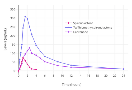 | Elimination half-life | Spironolactone: 1.4 hrs[10] 7α-TMS: 13.8 hours[10] 6β-OH-7α-TMS: 15.0 hrs[10] Canrenone: 16.5 hours[10] |