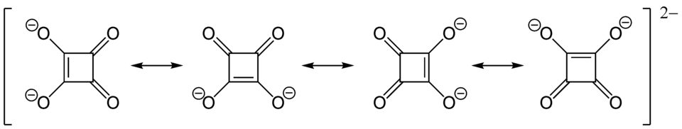 The structure of squaric acid is not a perfect square, as the carbon–carbon bond lengths are not quite equal. The high acidity with pKa1 = 1.5 for the first proton and pKa2 = 3.4 for the second is attributable to resonance stabilization of the anion.[6] Because the negative charges are equally distributed between each oxygen atom, the dianion of squaric acid is completely symmetrical (unlike squaric acid itself) with all C−C bond lengths identical and all C−O bond lengths identical.