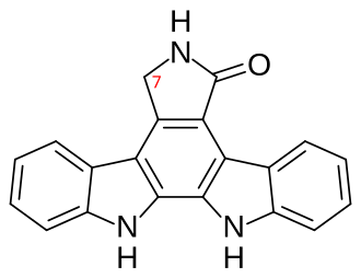 Staurosporine is an indolocarbazole. It belongs to the most frequently isolated group of indolocarbazoles: Indolo(2,3-a)carbazoles. Of these, Staurosporine falls within the most common subgroup, called Indolo(2,3-a)pyrrole(3,4-c)carbazoles. These fall into two classes - halogenated (chlorinated) and non-halogenated. Halogenated indolo(2,3-a)pyrrole(3,4-c)carbazoles have a fully oxidized C-7 carbon with only one indole nitrogen containing a β-glycosidic bond, while non-halogenated indolo(2,3-a)pyrrole(3,4-c)carbazoles have both indole nitrogens glycosylated, and a fully reduced C-7 carbon. Staurosporine is in the non-halogenated class.[8]