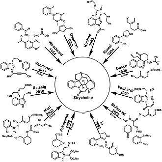 - ^ Woodward RB, Cava MP, Ollis WD, Hunger A, Daeniker HU, Schenker K (1954). "The total synthesis of strychnine". Journal of the American Chemical Society. 76 (18): 4749–4751. Bibcode:1954JAChS..76.4749W. doi:10.1021/ja01647a088.