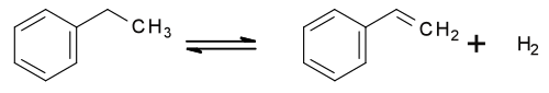 Around 80% of styrene is produced by the dehydrogenation of ethylbenzene. This is achieved using superheated steam (up to 600 °C) over an iron(III) oxide catalyst.[21] The reaction is highly endothermic and reversible, with a typical yield of 88–94%.