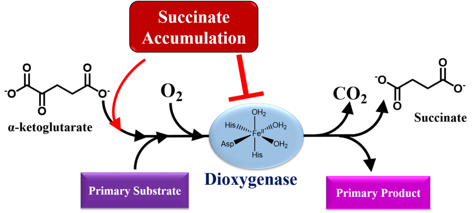 Accumulation of either fumarate or succinate reduces the activity of 2-oxoglutarate-dependent dioxygenases, including histone and DNA demethylases, prolyl hydroxylases and collagen prolyl-4-hydroxylases, through competitive inhibition.[39] 2-oxoglutarate-dependent dioxygenases require an iron cofactor to catalyze hydroxylations, desaturations and ring closures.[40] Simultaneous to substrate oxidation, they convert 2-oxoglutarate, also known as alpha-ketoglutarate, into succinate and CO2. 2-oxoglutarate-dependent dioxygenases bind substrates in a sequential, ordered manner.[40] First, 2-oxoglutarate coordinates with an Fe(II) ion bound to a conserved 2-histidinyl–1-aspartyl/glutamyl triad of residues present in the enzymatic center. Subsequently, the primary substrate enters the binding pocket and lastly dioxygen binds to the enzyme-substrate complex. Oxidative decarboxylation then generates a ferryl intermediate coordinated to succinate, which serves to oxidize the bound primary substrate.[40] Succinate may interfere with the enzymatic process by attaching to the Fe(II) center first, prohibiting the binding of 2-oxoglutarate. Thus, via enzymatic inhibition, increased succinate load can lead to changes in transcription factor activity and genome-wide alterations in histone and DNA methylation.
