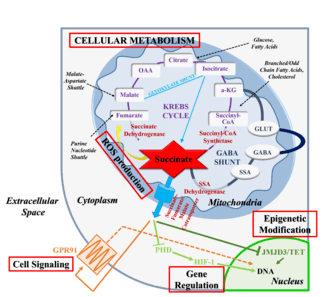 In addition to its metabolic roles, succinate serves as an intracellular and extracellular signaling molecule.[6][27] Extra-mitochondrial succinate alters the epigenetic landscape by inhibiting the family of 2-oxogluterate-dependent dioxygenases.[27] Alternative, succinate can be released into the extracellular milieu and the blood stream where it is recognized by target receptors.[31] In general, leakage from the mitochondria requires succinate overproduction or underconsumption and occurs due to reduced, reverse or completely absent activity of SDH or alternative changes in metabolic state. Mutations in SDH, hypoxia or energetic misbalance are all linked to an alteration of flux through the TCA cycle and succinate accumulation.[6][27][32] Upon exiting the mitochondria, succinate serves as a signal of metabolic state, communicating to neighboring cells how metabolically active the originating cell population is.[27] As such, succinate links TCA cycle dysfunction or metabolic changes to cell-cell communication and to oxidative stress-related responses.