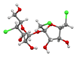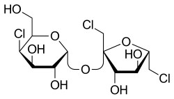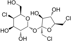Sucralose is a disaccharide composed of 1,6-dichloro-1,6-dideoxyfructose and 4-chloro-4-deoxygalactose. It is synthesized by the selective chlorination of sucrose in a multistep route that substitutes three specific hydroxyl groups with chlorine atoms. This chlorination is achieved by selective protection of one of the primary alcohols as an ester (acetate or benzoate), followed by chlorination with an excess of any of several chlorinating agent to replace the two remaining primary alcohols and one of the secondary alcohols, and then by hydrolysis of the ester.[31][32]