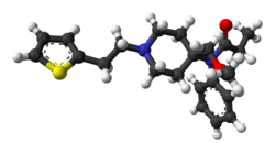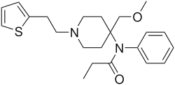 Sufentanil, sold under the brand names Sufenta among others, is a synthetic opioid analgesic drug approximately 5 to 10 times as potent as its parent drug, fentanyl, and 500 to 1,000 times as potent as morphine. Structurally, sufentanil differs from fentanyl through the addition of a methoxymethyl group on the piperidine ring (which increases potency but is believed to reduce duration of action[6]), and the replacement of the phenyl ring by thiophene. Sufentanil first was synthesized at Janssen Pharmaceutica in 1974.[7]