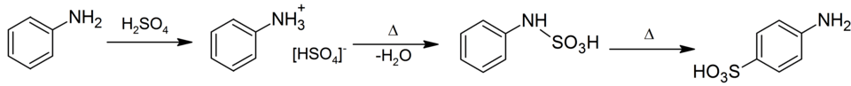 Sulfanilic acid can be produced by sulfonation of aniline with concentrated sulfuric acid.[5] This proceeds via phenylsulfamic acid; a zwitterion with a N-S bond. Eugen Bamberger originally proposed a mechanism involving a series of intramolecular rearrangements, with phenylsulfamic acid forming orthanilic acid, which rearranged to sulfanilic acid on heating.[6][7] Subsequent radiosulphur studies showed that the process is intermolecular, with the phenylsulfamic acid desulfating to generate sulfur trioxide, which then reacts with aniline at the para position in manner similar to a Bamberger rearrangement.[8][9]