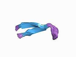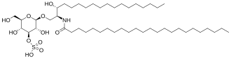 Sulfatide, also known as 3-O-sulfogalactosylceramide, SM4, or sulfated galactocerebroside, is a class of sulfolipids, specifically a class of sulfoglycolipids, which are glycolipids that contain a sulfate group.[1] Sulfatide is synthesized primarily starting in the endoplasmic reticulum and ending in the Golgi apparatus where ceramide is converted to galactocerebroside and later sulfated to make sulfatide. Of all of the galactolipids that are found in the myelin sheath, one fifth of them are sulfatide. Sulfatide is primarily found on the extracellular leaflet of the myelin plasma membrane produced by the oligodendrocytes in the central nervous system and in the Schwann cells in the peripheral nervous system. However, sulfatide is also present on the extracellular leaflet of the plasma membrane of many cells in eukaryotic organisms.[2]