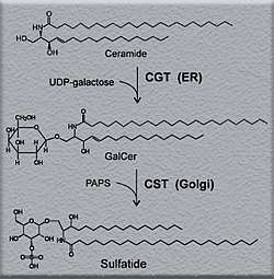 Sulfatide synthesis begins with a reaction between UDP-galactose and 2-hydroxylated or non-hydroxylated ceramide. This reaction is catalyzed by galactosyltransferase (CGT), where galactose is transferred to 2-hydroxylated, or non-hydroxylated ceramide, from UDP-galactose.[1] This reaction occurs in the luminal leaflet of the endoplasmic reticulum, and its final product is GalCer, or galactocerebroside, which is then transported to the Golgi apparatus.[1][2] Here, GalCer reacts with 3’-phosphoadenosine-5’-phosphosulfate (PAPS) to make sulfatide. This reaction is catalyzed by cerebroside sulfotransferase (CST).[1] CST is a homodimeric protein that is found in the Golgi apparatus.[1] It has been demonstrated that mice models lacking CST, CGT, or both are incapable of producing sulfatide indicating that CST and CGT are necessary components of sulfatide synthesis.[2]