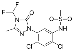 Sulfentrazone is the ISO common name[3] for an organic compound used as a broad-spectrum herbicide. It acts by inhibiting the enzyme protoporphyrinogen oxidase.[4] It was first marketed in the US in 1997 by FMC Corporation with the brand name Authority.