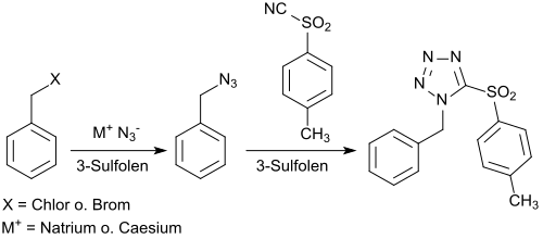 The reversibility of the interconversion of 3-sulfolene with buta-1,3-diene and sulfur dioxide suggests the use of sulfolene as a recyclable aprotic dipolar solvent, in replacement for dimethyl sulfoxide (DMSO), which is often used but difficult to separate and poorly reusable.[26] As a model reaction, the reaction of benzyl azide with 4-toluenesulfonic acid cyanide forming 1-benzyl-5-(4-toluenesulfonyl)tetrazole was investigated. The formation of the tetrazole can also be carried out as a one-pot reaction without the isolation of the benzyl azide with 72% overall yield.