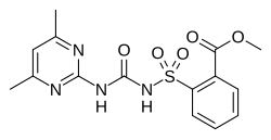 Sulfometuron methyl is an organic compound used as an herbicide.[1] It is classed as a sulfonylurea. It functions via the inhibition of the enzyme acetolactate synthase, which catalyzes the first step in biosynthesis of the branched-chain amino acids valine, leucine, and isoleucine.[2]