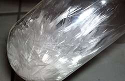 If SO3 is condensed above 27 °C, then α-SO3 forms, which has a melting point of 62.3 °C. α-SO3 is fibrous in appearance. Structurally, it is the polymer [S(=O)2(μ-O)]n. Each end of the polymer is terminated with OH groups.[1] β-SO3, like the alpha form, is fibrous but of different molecular weight, consisting of an hydroxyl-capped polymer, but melts at 32.5 °C. Both the gamma and the beta forms are metastable, eventually converting to the stable alpha form if left standing for sufficient time. This conversion is caused by traces of water.[11]