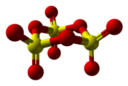 Both liquid and gaseous[8] SO3 exists in an equilibrium between the monomer and the cyclic trimer. The nature of solid SO3 is complex and at least 3 polymorphs are known, with conversion between them being dependent on traces of water.[9]