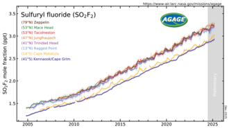 - ^ a b c d Mühle, J., J. Huang, R.F. Weiss, R.G. Prinn, B.R. Miller, P.K. Salameh, C.M. Harth, P.J. Fraser, L.W. Porter, B.R. Greally, S. O'Doherty, and P.G. Simmonds, Sulfuryl Fluoride in the Global Atmosphere, Journal of Geophysical Research, 114, D05306, doi:10.1029/2008JD011162, 2009