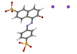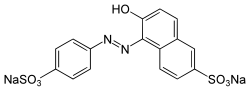 Sunset yellow FCF (also known as orange yellow S, or C.I. 15985) is a petroleum-derived orange azo dye with a pH-dependent maximum absorption at about 480 nm at pH 1 and 443 nm at pH 13, with a shoulder at 500 nm.[1][2]: 463 When added to foods sold in the United States, it is known as FD&C Yellow 6; when sold in Europe, it is denoted by E Number E110.[3]
