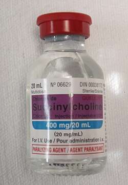 - ^ Dewachter P, Mouton-Faivre C (February 2016). "Frozen succinylcholine: the danger of being overzealous with its cold storage". Br J Anaesth. 116 (2): 299–300. doi:10.1093/bja/aev465. PMID 26787804.