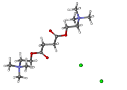 Suxamethonium is an odorless, white crystalline substance. Aqueous solutions have a pH of about 4. The dihydrate melts at 160 °C, whereas the anhydrous melts at 190 °C. It is highly soluble in water (1 gram in about 1 mL), soluble in ethyl alcohol (1 gram in about 350 mL), slightly soluble in chloroform, and practically insoluble in ether. Suxamethonium is a hygroscopic compound.[27] The compound consists of two acetylcholine molecules that are linked by their acetyl groups. It can also be viewed as a central moiety of succinic acid with two choline moieties, one on each end.