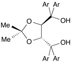 TADDOLs consist of a dioxolane ring substituted with two mutually transoid diarylhydroxymethyl Ar2COH) groups. They are derived from d,l-tartaric acid, an inexpensive C2-symmetric molecule. Condensation of dimethyl ester of d,l-tartaric acid with acetone gives the acetonide, a particular kind of dioxalane. The ester groups are susceptible to reaction with aryl Grignard reagents, leading after hydrolysis to the diol.[2]